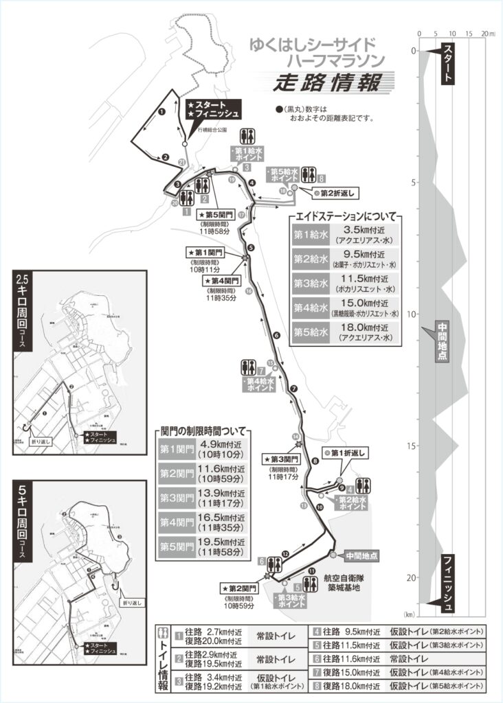 ハーフマラソンの部においては、各関門地点および制限時間、各エイドステーション、コース上のトイレ位置などを掲載しています。