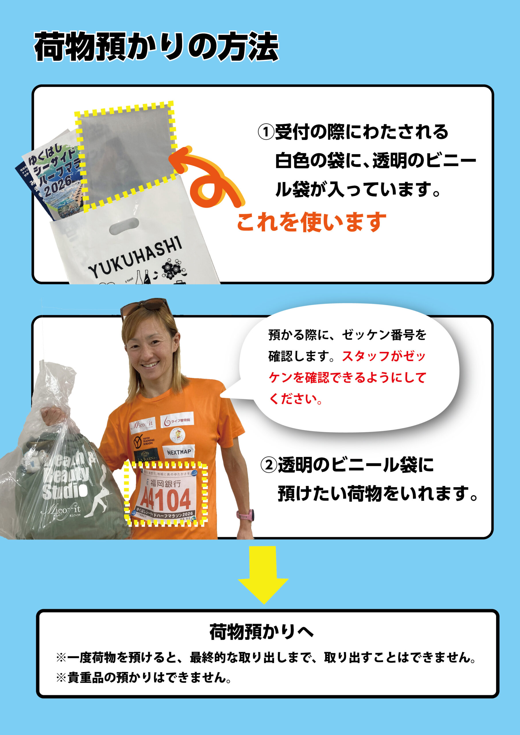 荷物を預ける際は、スタッフがゼッケン番号を確認しますので、ゼッケンが見える状態で荷物預かり所へお越しください。