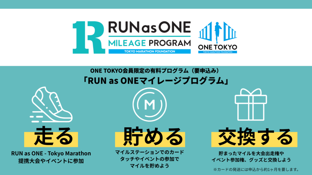 RUN as ONE マイルを貯め、貯まったマイルを大会出走権やイベント参加権、オリジナルグッズ、